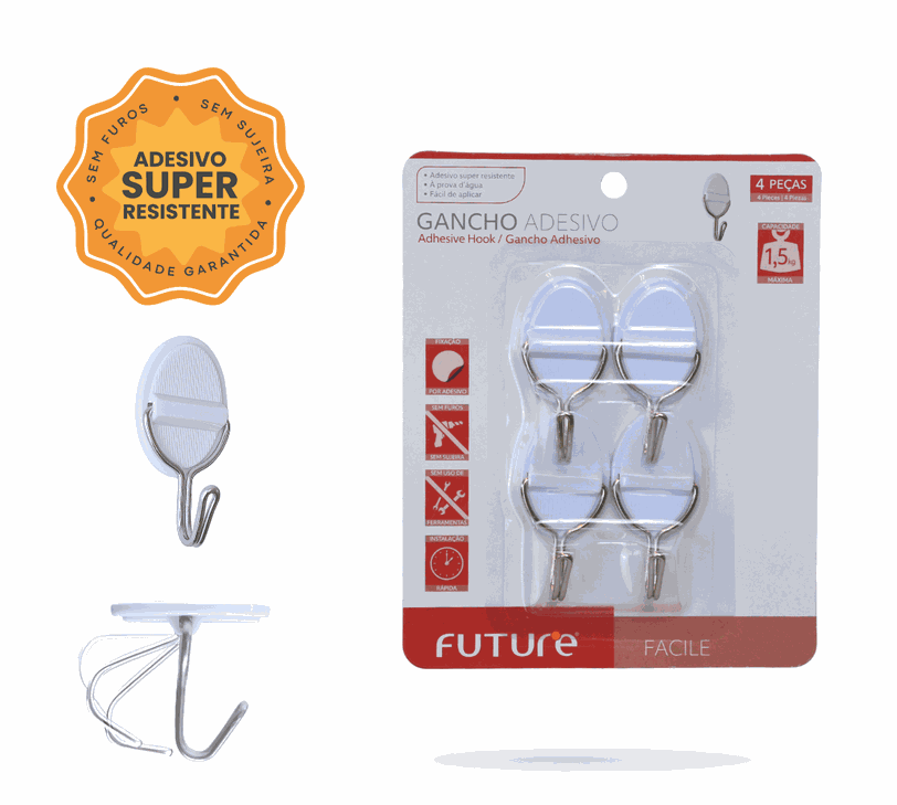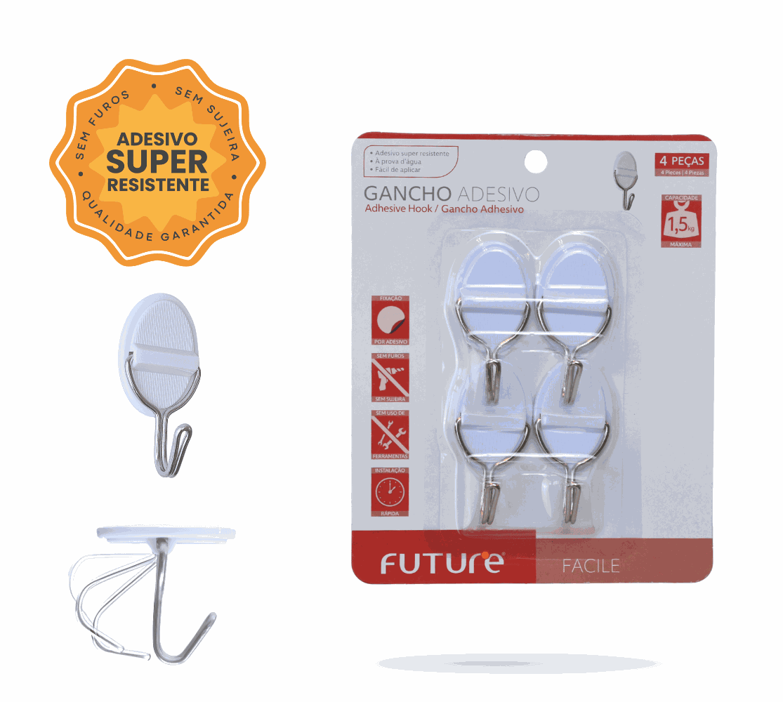 Esse modelo do Gancho Adesivo Future, pode ser instalado tanto na vertical quanto na horizontal, adaptando-se a diferentes espaços e formas de uso. Seu gancho em metal se ajusta naturalmente à posição do item pendurado. Cada cartela possui 4 unidades. LINHA FACILE.