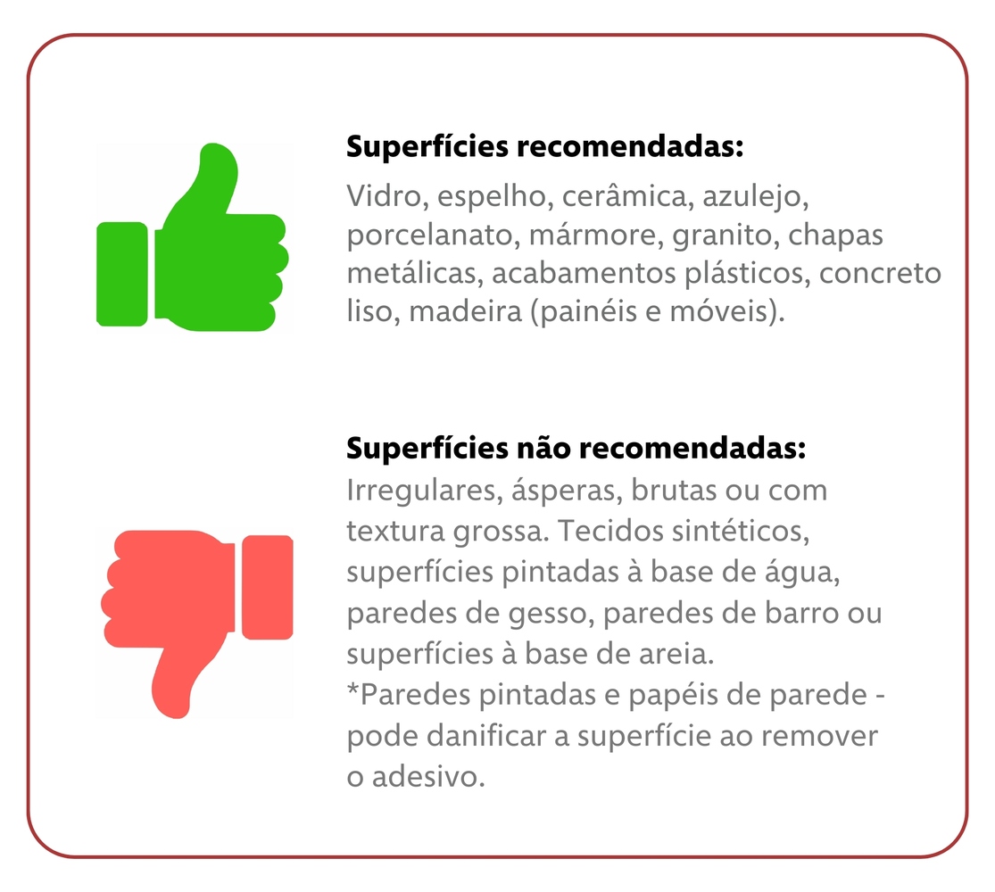Correto: Vidro, espelho, cerâmica, azulejo, porcelanato, mármore, granito, chapas metálicas, acabamentos plásticos, concreto liso, madeira (painéis e móveis).Incorreto: Superfícies irregulares, ásperas, brutas ou com textura grossa. Tecidos sintéticos, superfícies pintadas à base de água, paredes de gesso, paredes de barro ou superfícies à base de areia. *Paredes pintadas e papéis de parede – pode danificar a superfície ao remover o adesivo.