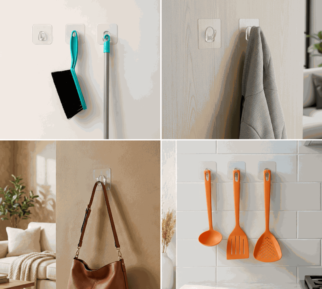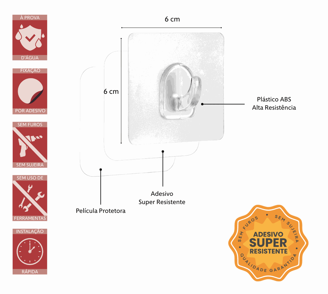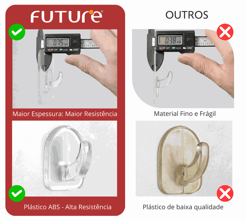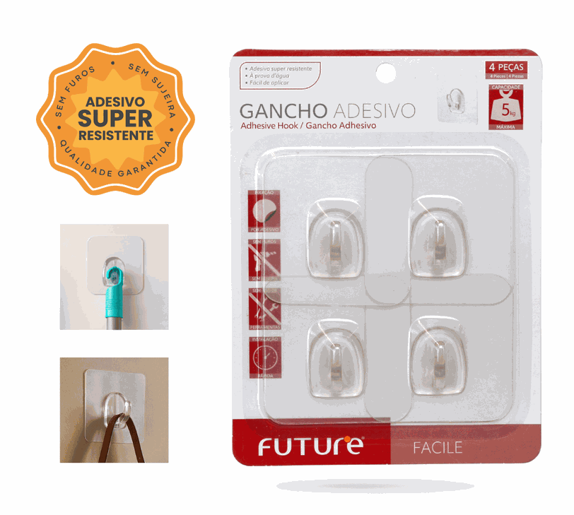 Com design discreto e alta resistência, o Gancho Adesivo da Future é uma solução prática para pendurar objetos com firmeza e segurança. LINHA FACILE.