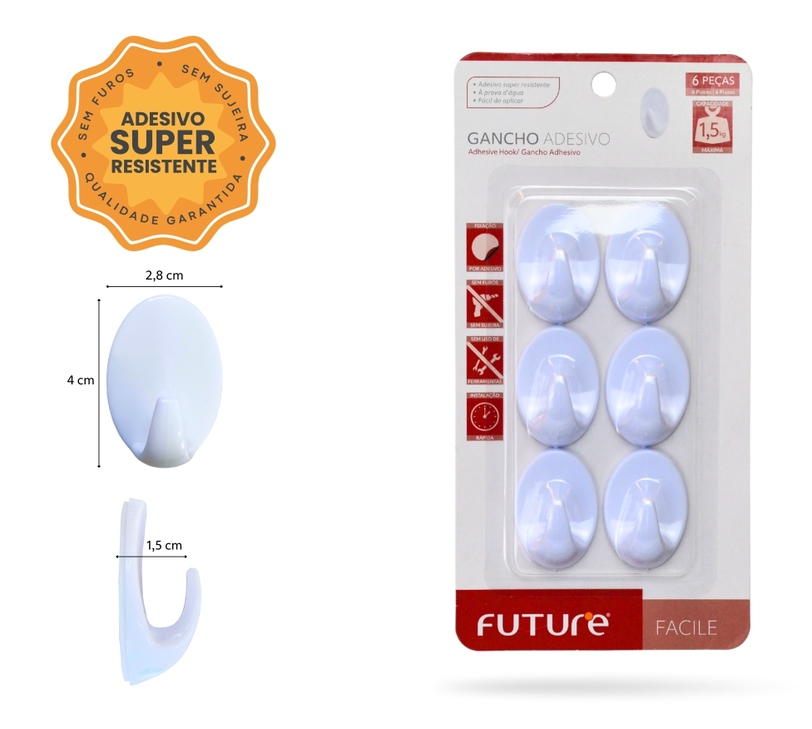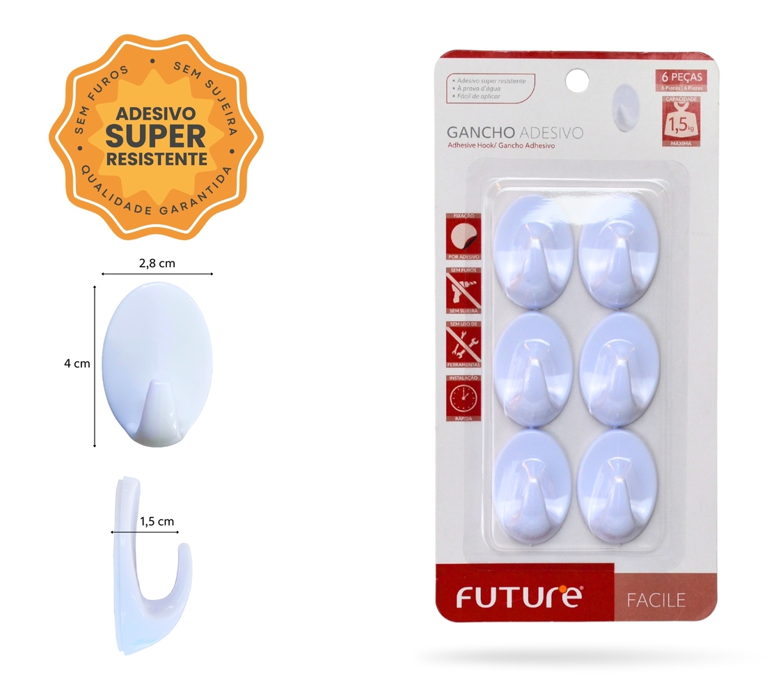 Compacto e funcional, o Gancho Adesivo Pequeno é ideal para organizar itens leves do dia a dia com praticidade. Sua fixação por adesivo super resistente dispensa furos e ferramentas. 6 Unidades por cartela. LINHA FACILE.