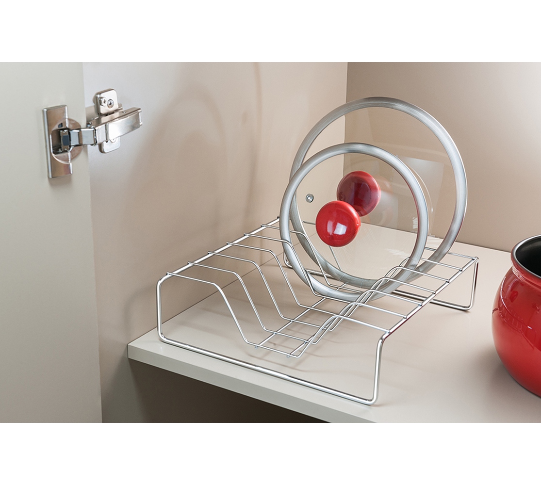 Prático, o Organizador de Tampas de Panela faz com que o armário fique organizado e funcional. Tudo em seu devido lugar!